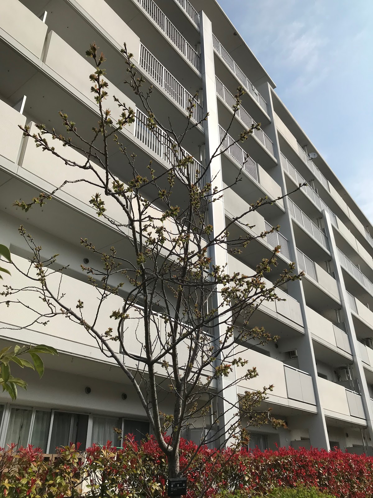 花色は桃から赤のさくらにしては大きな花で八重咲き、まだ五分咲き(紅色が鮮やかな八重桜)。