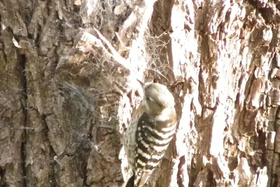 初めて見る白い横シマの在る雀より一回り大きなのが、葉の落ちた柳の幹に器用にしがみつく。  ※ 一番小さなキツツキ